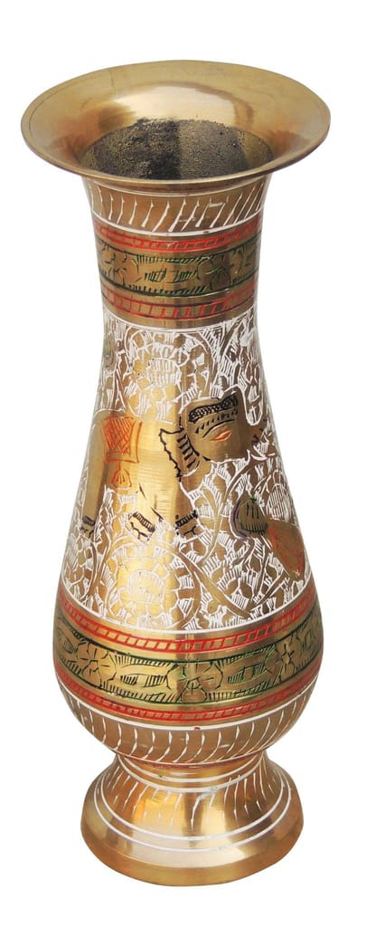 This vase is made of high quality brass by our trained craftsman. This vase is than worked upon by our artisian to give it multicolur unique look. Its complete hand crafted item made by trained indian craftsman. This can be used for decoration purpose and can be used to hold cut flowers.