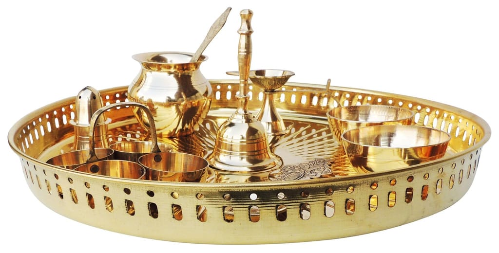 Brass Puja Thali Set With Multiple Items - 13.2*13.2*1.6 inch (Z476 F)