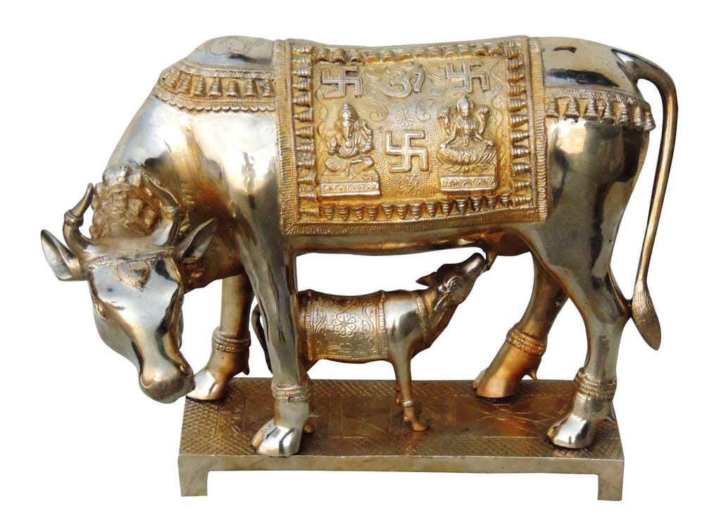 This Cow & Calf Statue Is Made up of Pure Brass Metal. Kamdhenu cow along with its calf signifies love & prosperity and is considered highly auspicious for countering the vastu doshas (architectural faults) & enhancing the overall good luck.It is believed that each part of the Kamdhenu cow embodies a particular deity. It is also believed that as Kalpa-vriksha, (heavenly tree) Kamadhenu, in the same way, fulfills the desires of those who approach it with devotion. Ideal to keep in home or gift on new house warming, birthday anniversary occasion. This unique piece also has auspicious Hindu symbols of Om & Swastika. Memorable handmade decor statue.