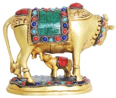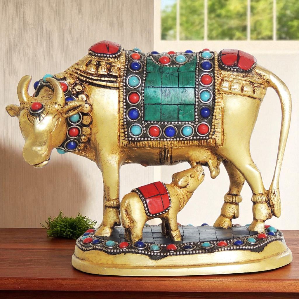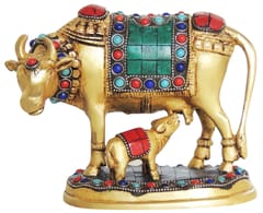 This Cow & Calf Statue Is Made up of Pure Brass Metal. Kamdhenu cow along with its calf signifies love & prosperity and is considered highly auspicious for countering the vastu doshas (architectural faults) & enhancing the overall good luck.It is believed that each part of the Kamdhenu cow embodies a particular deity. It is also believed that as Kalpa-vriksha, (heavenly tree) Kamadhenu, in the same way, fulfills the desires of those who approach it with devotion. Ideal to keep in home or gift on new house warming, birthday anniversary occasion. This unique piece also has auspicious Hindu symbols of Om & Swastika. Memorable handmade decor statue.