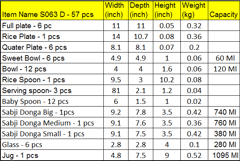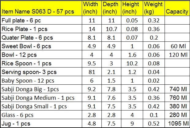 +917351007433 https://www.brassgiftonline.com/s/5fa28c32f990d2c26c566c66/5fbf7a310348f35edc571cf1/logo-final-480x480.jpg" [email protected] 6010f4c3beab02af31482a46 Dinner Set Lazer Craft 57 pcs - 2*2*2 inch (S063 D) https://www.brassgiftonline.com/s/5fa28c32f990d2c26c566c66/69bab46c74d09c98b88d1df4/s063-d_47.jpg | Item Name | Width(inch) | Depth (inch) | Height (inch) | Weight (Kg) |